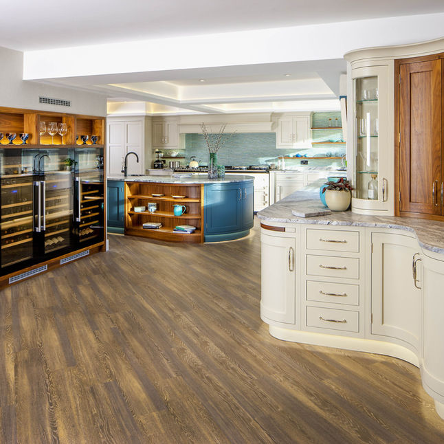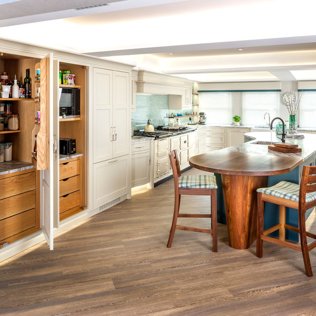 This classic inframe painted shaker kitchen combines traditional elegance with bespoke details. The standout island unit features a walnut peninsula and a Sensa Sant Angelo suede finish natural stone, offering both warmth and sophistication. A traditional AGA serves as a timeless centerpiece, while the built-in larder unit with an integrated fridge/freezer ensures seamless storage.